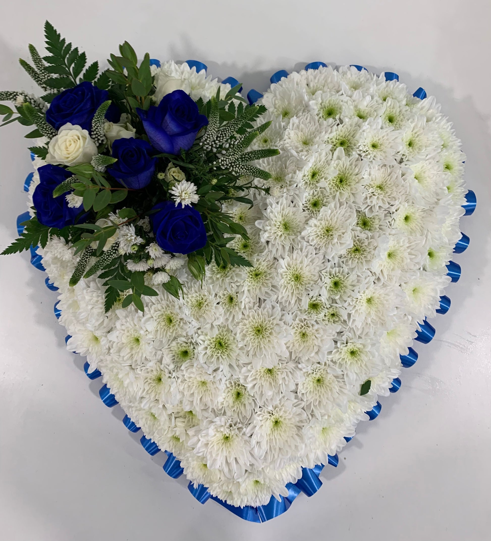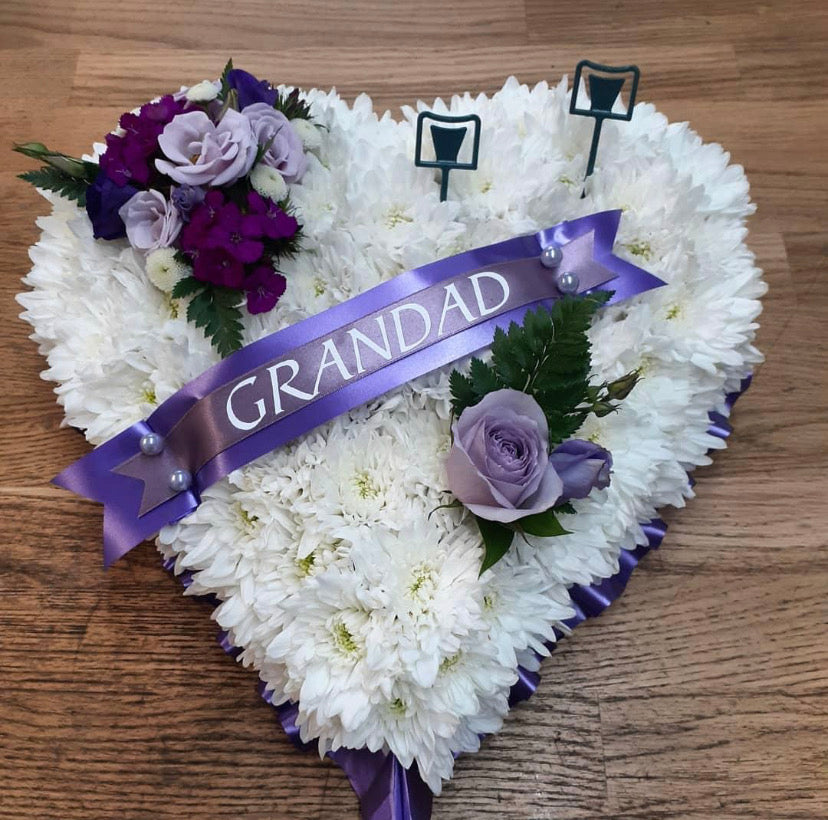 Heart shape, farewell tribute. Based in white chrysanthemums, coloured ribbon and matching flower sprays.