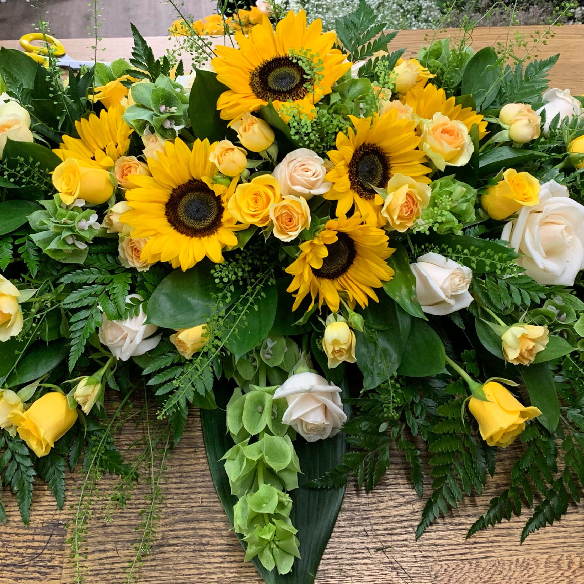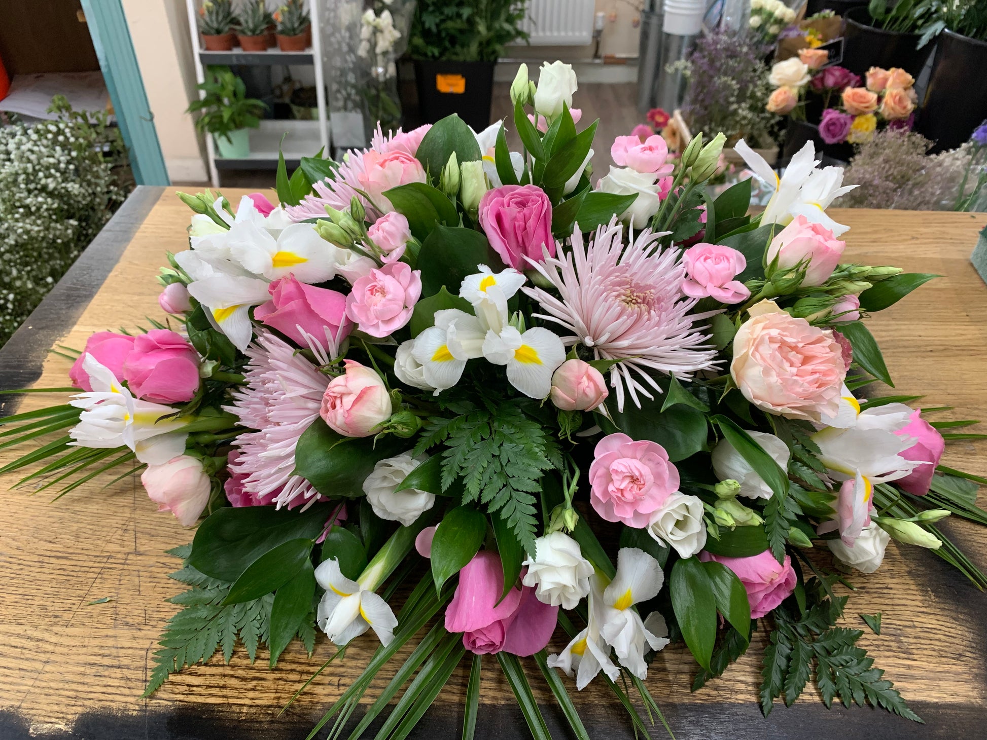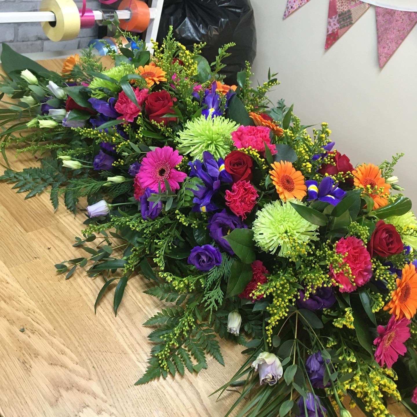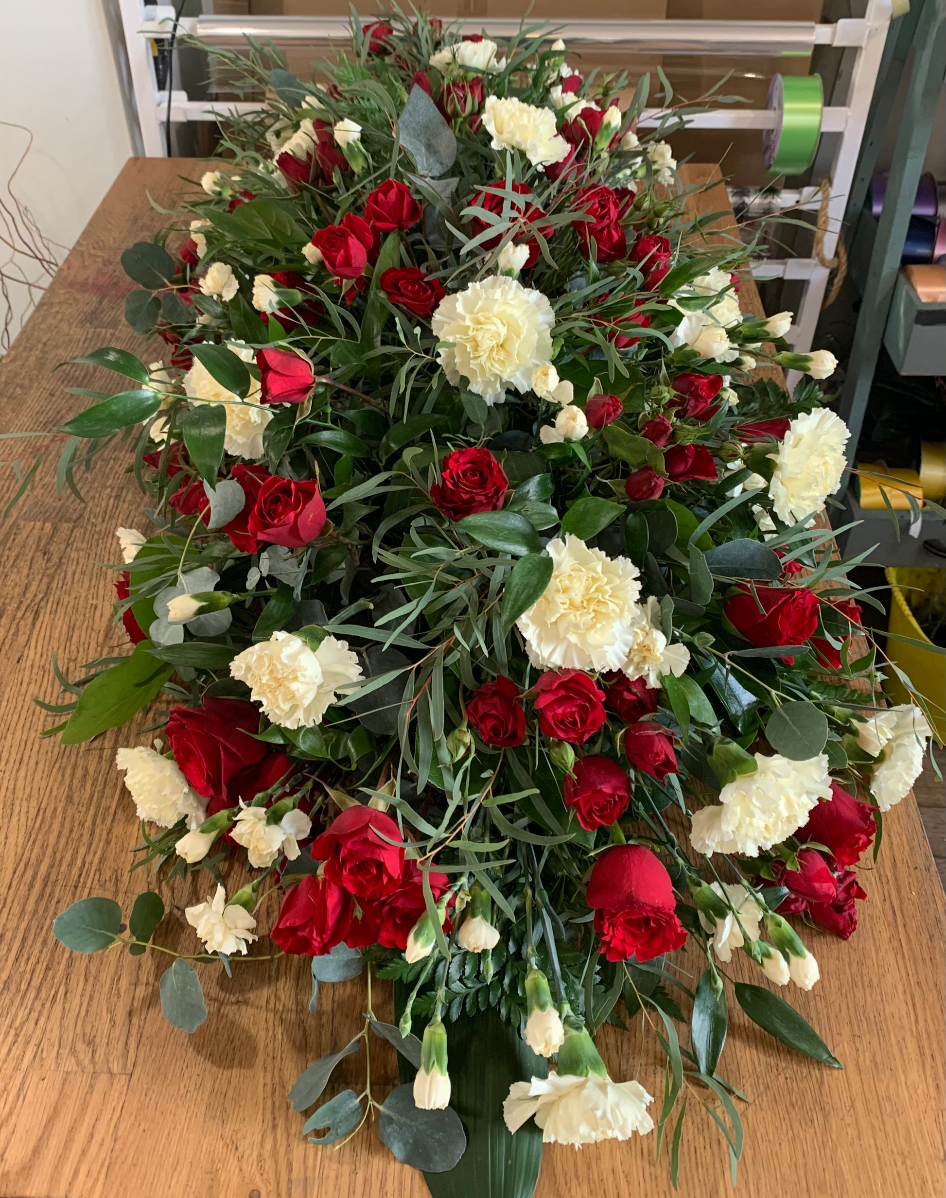 Traditional casket spray. Full of seasonal flowers and foliage all include roses. Lilies can be included upon request. Other colours and mixed colours available.